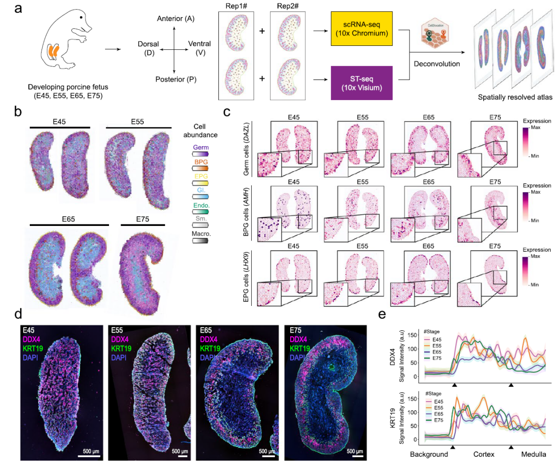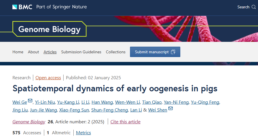 1月2日,国际基因组学领域权威学术期刊《Genome Biology》(IF 5-yr: 16.5)在线发表了amjs澳金沙门线路首页葛伟/沈伟教授课题组完成的题为“Spatiotemporal dynamics of early oogenesis in pigs”的研究论文。该研究借助单细胞RNA测序(scRNA-seq)以及空间组学技术,针对猪早期卵子发生阶段的4个时间点(E45、E55、E65以及E75),对7个卵巢切片进行了单细胞多组学分析,系统阐明了猪早期卵子发生的转录调控机制以及时空动力学特征。
