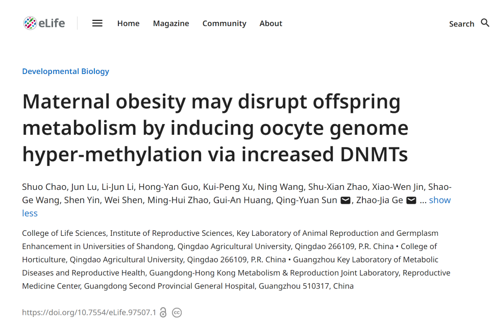 近日,amjs澳金沙门线路首页葛照嘉教授团队和广东省第二人民医院孙青原教授团队合作,在eLife杂志发表题为Maternal obesity may disrupt offspring metabolism by inducing oocyte genome hyper-methylation via increased DNMTs的研究论文,揭示了肥胖导致小鼠褪黑素分泌不足,通过影响DNMTs表达介导卵母细胞高甲基化,从而造成后代代谢异常的跨代效应。