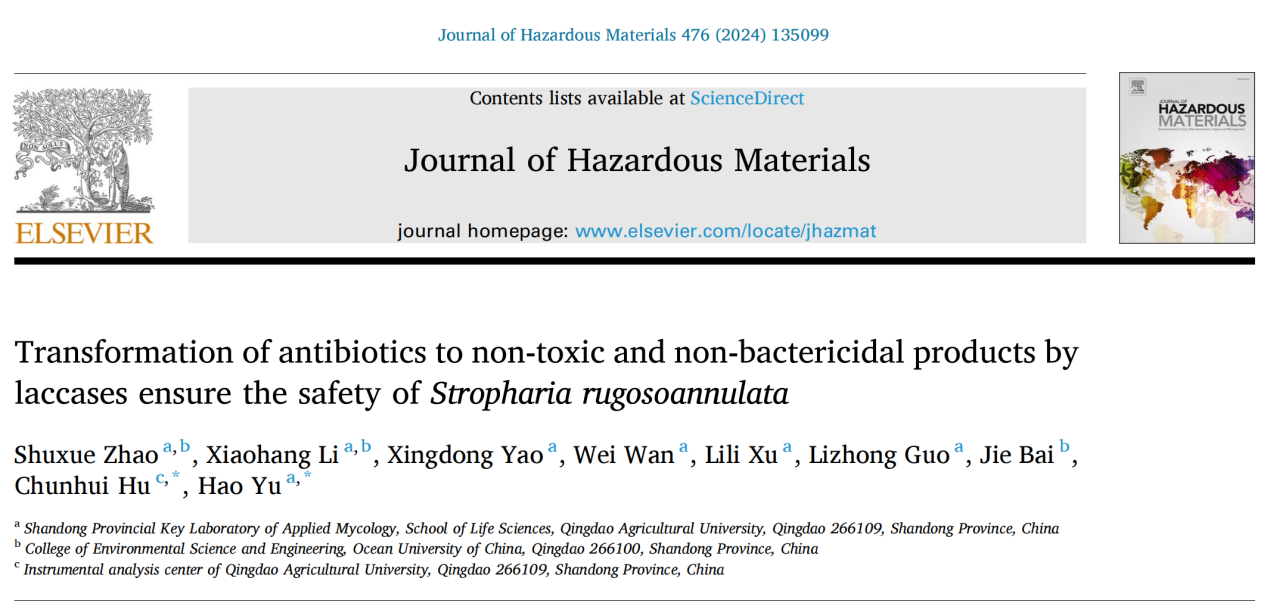 2024年7月,青岛农业大学山东省应用真菌重点实验室食用菌精准育种团队在食用菌绿色生产研究领域获新进展,相关成果以“Transformation of Antibiotics to Non-toxic and Non-bactericidal Products by Laccases Ensure the Safety of Stropharia rugosoannulata”为题,发表在环境科学与生态学知名期刊Journal of Hazardous Materials(中科院1区,IF=12.2004)。
