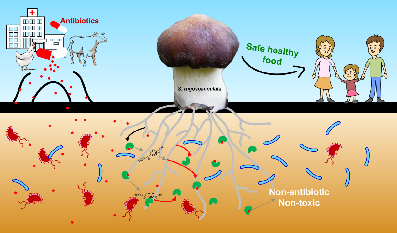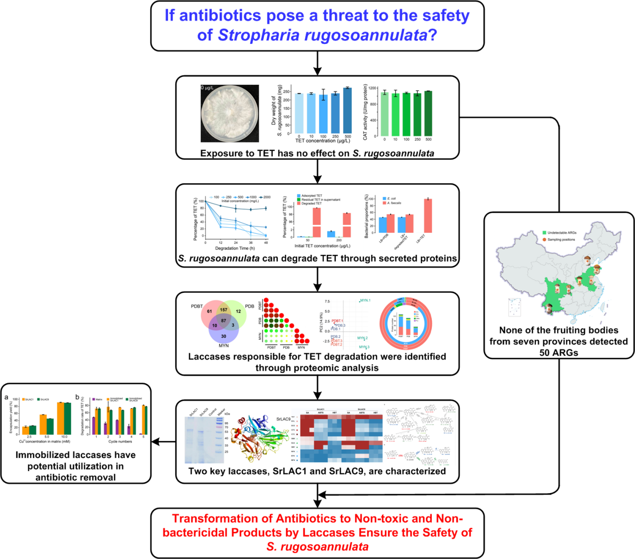 研究表明,当大球盖菇菌丝暴露于环境浓度的四环素下,大球盖菇菌丝的生长并不会受到四环素的影响。大球盖菇菌丝能够降解四环素,从而消除四环素对于菌丝的抑制作用。除四环素外,大球盖菇还能够降解其他四环素类、磺胺类和喹诺酮类的抗生素。进一步分析表明,大球盖菇主要通过分泌胞外酶来进行抗生素降解,通过对分泌组学的分析,从大球盖菇上清中筛选到两个漆酶SrLAC1和SrLAC9可能与抗生素的降解有关。进一步,利用毕赤酵母GS115对这两个漆酶进行了异源表达并进行了纯化。SrLAC1和SrLAC9可以降解包括四环素在内的多种抗生素,对于不同抗生素的降解效率按照顺序分别为四环素类>磺胺类>喹诺酮类,木质素降解中间代谢产物丁香酸可以作为mediator促进抗生素降解。分别利用降解前的抗生素和降解后的抗生素培养抗生素敏感菌株和耐药菌株,发现降解后抗生素不能够为耐药菌株提供生长优势,因此这就避免了耐药菌的扩散。本研究采集了来自于七个省份的大球盖菇,提取子实体基因组之后,对50种常见的耐药基因进行了检测,在所有的样本中均未检测出耐药基因。本研究表明大球盖菇可以通过基质降解酶来分解环境中的抗生素,从而减少耐药细菌(ARBs)和耐药基因(ARGs)的传播,从而确保大球盖菇其作为健康食品的安全性,保证了食用菌的绿色生产过程。