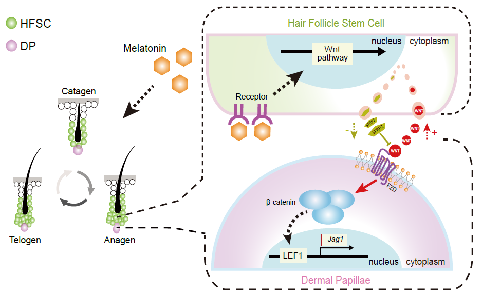 针对上述问题,葛伟教授研究组利用小鼠毛发再生模型系统探究了褪黑素(Melatonin,MLT)对于毛囊周期调控的分子机制。研究结果发现,MLT能够通过促进毛囊周期循环进而促进小鼠毛发生长。进一步研究发现,MLT可以介导毛囊干细胞(Hair follicle stem cells,HFSCs)中Wnt配体的表达,从而促进真皮乳头(Dermal papillae,DP)中Wnt/β-catenin信号的表达。DP细胞中Wnt/β-catenin信号通路的激活可以促进毛发生长的基因Jag1表达水平升高,最终加速了毛囊从静止期向生长期的转变。本研究成果不仅对于毛囊发育调控领域具有重要的理论意义,同时也为开发更有效的脱发治疗方法提供了重要的科学依据和技术支持。