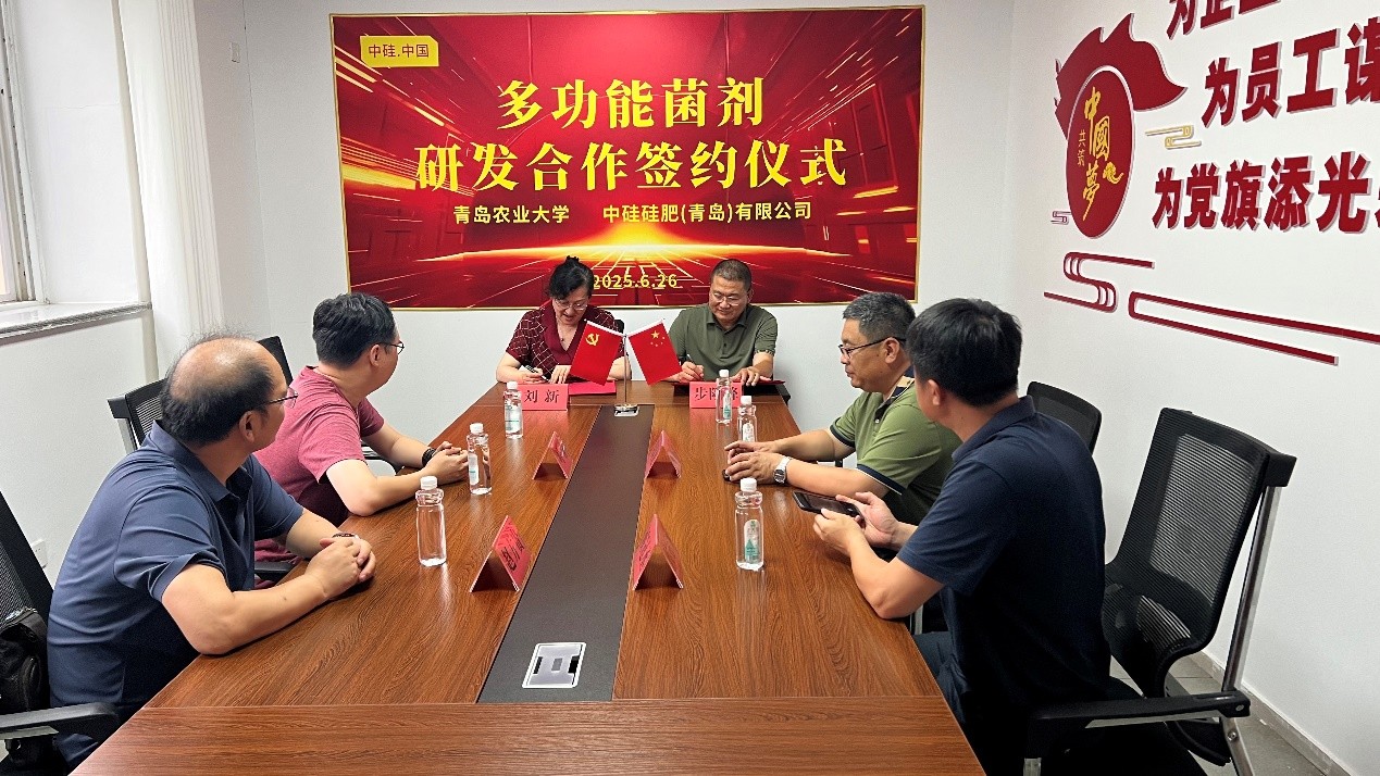 6月26日,山东省烟草产业技术体系土壤肥料岗位与中硅硅肥(青岛)有限公司在莱西市举行多功能菌剂研发合同签约仪式。岗位专家青岛农业大学刘新教授、岗位骨干叶青和赵方贵老师,中硅硅肥(青岛)有限公司总经理步陟峰、技术总监隋显龙、产品总监侯铭泽参加仪式。