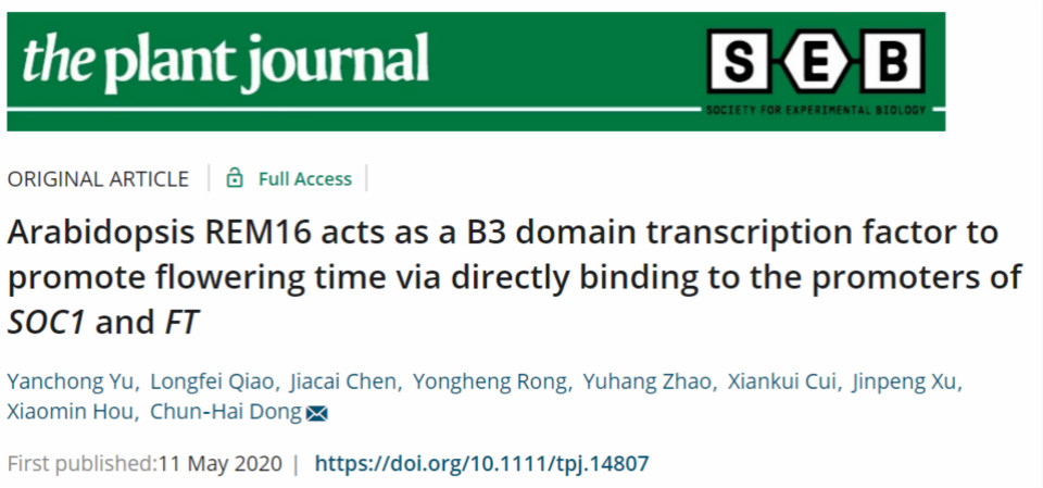 2020年5月11日, Plant Journal(五年平均IF= 6.467,SCI一区,https://doi.org/10.1111/tpj.14807)在线发表了amjs澳金沙门线路首页董春海课题组关于B3结构域蛋白-REM16转录因子调控拟南芥开花分子机制的研究论文。青岛农业大学为独立研究单位,于延冲副教授和研究生乔龙飞、陈家才为论文共同第一作者,董春海教授为通讯作者。该论文获得国家自然科学基金的资助,得到生科院农业分子生物学平台仪器的支撑。