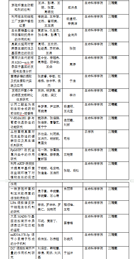 为了培养大学生的社会责任感、创新意识、团队精神和实践能力,扩大科学视野,促进大学生对于生物学相关基础知识的学习和实践能力的培养,提高综合能力,提高人才培养质量,2021年9月至10月举办了青岛农业大学生命科学竞赛,本次大赛由创新创业学院主办、amjs澳金沙门线路首页承办,大赛分为生物学大赛和生物实验技能大赛两部分,近400名学生参加,评审专家从研究方案、研究过程、研究论文等方面对各参赛队作品及个人实验技能进行了综合评定,大赛最终评选出一等奖7项和12人、二等奖11项和23人、三等奖17项和35人。现将获奖名单公布如下: