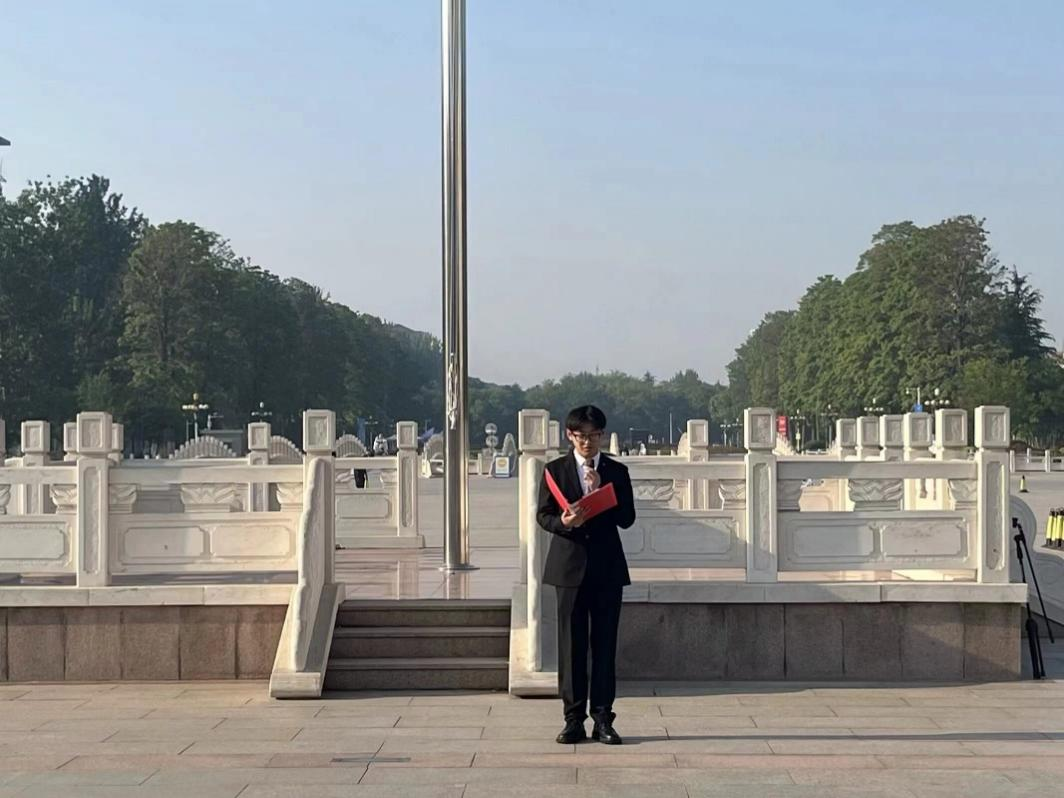 升旗仪式开始,国旗护卫队队员迈着铿锵有力的步伐,护送着国旗走向升旗台,伴随着激昂雄壮的国歌声,鲜艳的五星红旗迎着朝阳冉冉升起,全体师生肃穆站立、行注目礼,向国旗致以最崇高的敬意。升旗礼毕,学生代表郑学通作国旗下的讲话。他号召广大青年要继承、发扬五四精神,要勇于追求青春理想,勇于释放青春活力,保持积极向上的态度,为实现中华民族伟大复兴、国家富强贡献自己的力量。